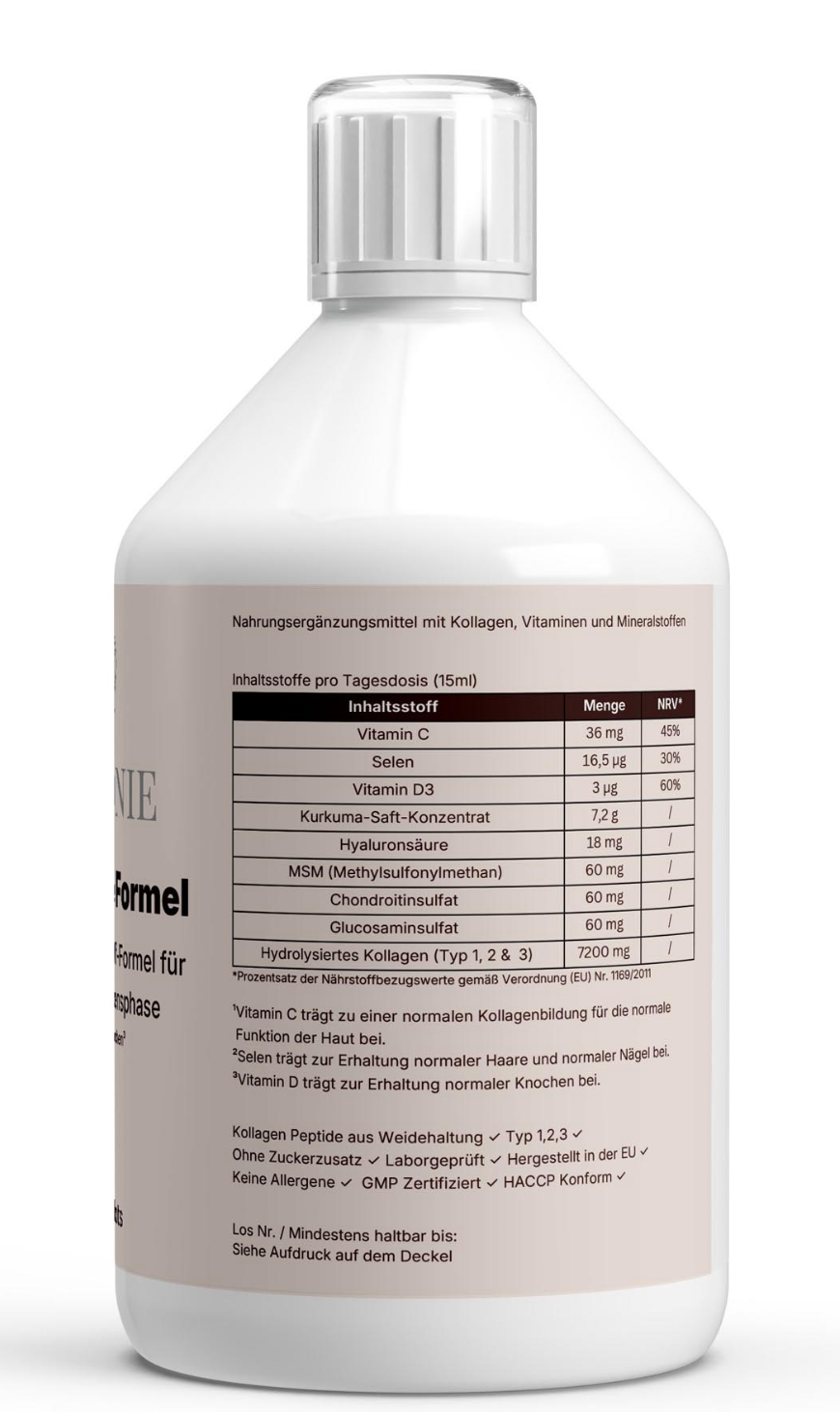 Ergänzend zur inneren Versorgung enthält die Formel Komponenten, die das Hautbild ernährungstechnisch begleiten: Hydrolysiertes Kollagen, Hyaluronsäure, Kurkuma‑Saft‑Konzentrat und Vitamin C.